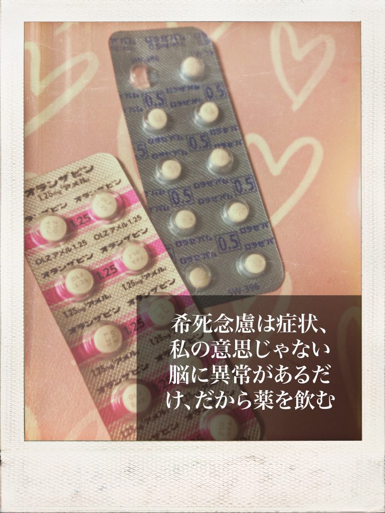 これは全部私の場合です。薬でのコントロールは本当に大事だけど、たくさん薬を飲んでるせいで希死念慮が出てくることもある。医師と相談しなければならない。